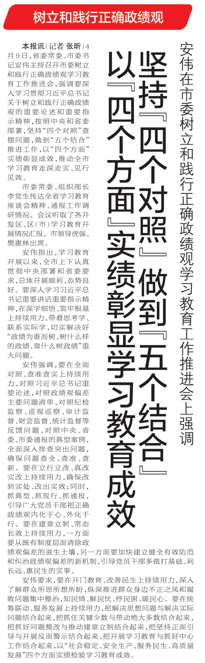 4月9日,省委常委、市委书记安伟主持召开市委树立和践行正确政绩观学习教育工作推进会,强调要深入学习贯彻习近平总书记关于树立和践行正确政绩观的重要论述和重要指示精神,按照中央和省委部署,坚持“四个对照”查摆问题,做到“五个结合”推进工作,以“四个方面”实绩彰显成效,推动全市学习教育走深走实、见行见效。(今日《郑州日报》1版)