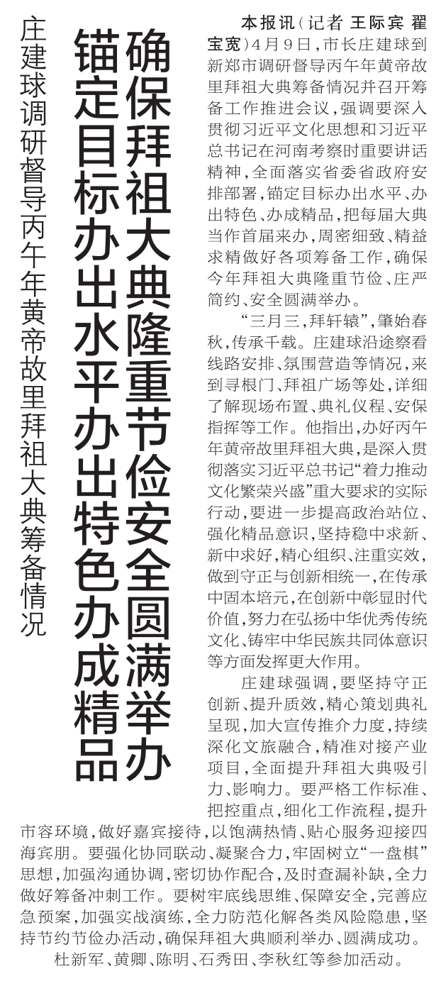 4月9日,市长庄建球到新郑市调研督导丙午年黄帝故里拜祖大典筹备情况并召开筹备工作推进会议,强调要深入贯彻习近平文化思想和习近平总书记在河南考察时重要讲话精神,全面落实省委省政府安排部署,锚定目标办出水平、办出特色、办成精品,把每届大典当作首届来办,周密细致、精益求精做好各项筹备工作,确保今年拜祖大典隆重节俭、庄严简约、安全圆满举办。(今日《郑州日报》1版)