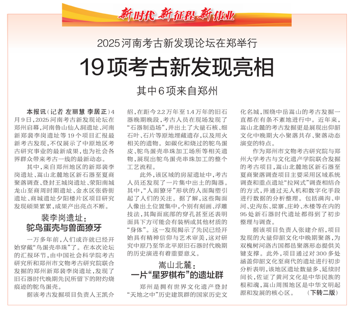 4月9日,2025河南考古新发现论坛在郑州启幕,河南鲁山仙人洞遗址、河南新郑裴李岗遗址等19个项目汇报最新考古发现,不仅展示了中原地区考古研究事业的最新成果,也为社会各界群众带来考古一线的最新动态。(今日《郑州日报》1版、2版)