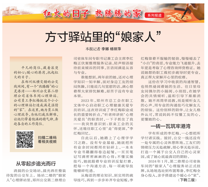 在郑州纵横交错的公交线网间,有一个“热腾腾”的心灵港湾——郑州公交第二修理公司省体车间心理驿站。公司员工李红梅把这个小小的心理驿站打造成满是温情的“家”。在这里,她为员工做心理疏导,为他们减压解难,让他们带着饱满的精气神,奔赴各自的工作岗位。(今日《郑州日报》1版、2版)