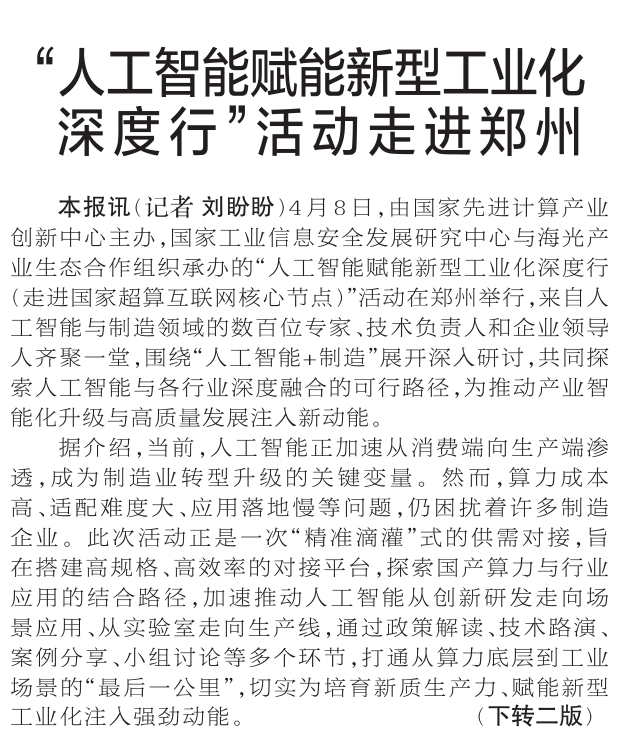 4月8日,由国家先进计算产业创新中心主办,国家工业信息安全发展研究中心与海光产业生态合作组织承办的“人工智能赋能新型工业化深度行(走进国家超算互联网核心节点)”活动在郑州举行,来自人工智能与制造领域的数百位专家、技术负责人和企业领导人齐聚一堂,围绕“人工智能+制造”展开深入研讨,共同探索人工智能与各行业深度融合的可行路径,为推动产业智能化升级与高质量发展注入新动能。(今日《郑州日报》1版、2版)