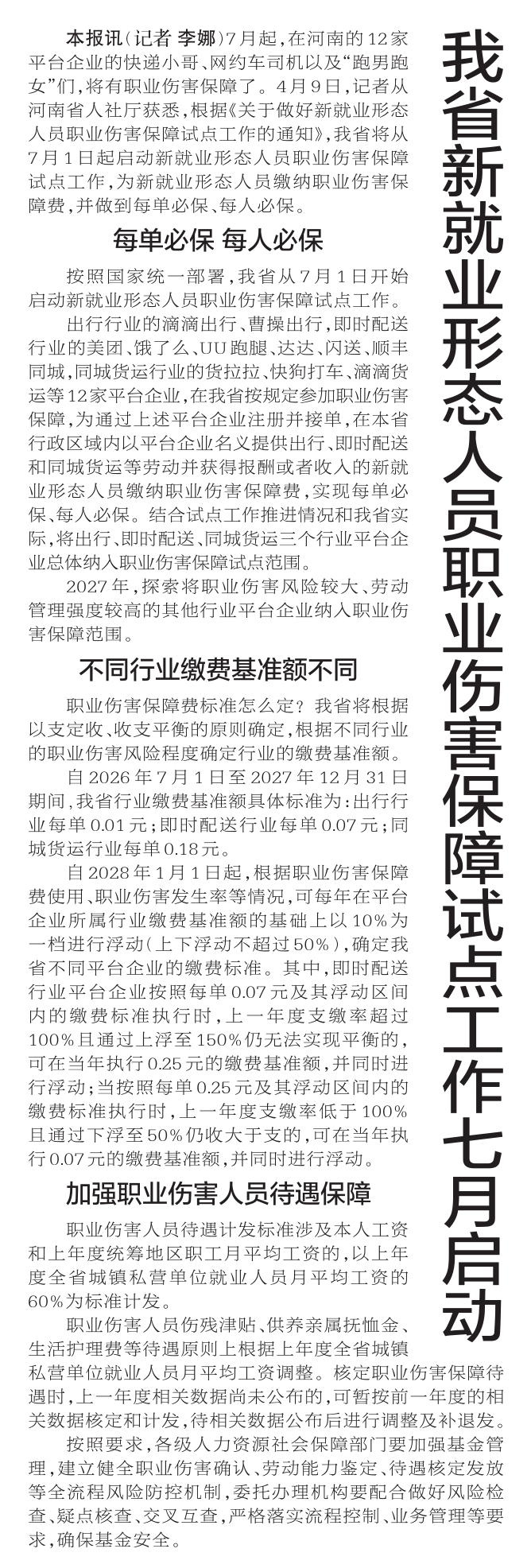 7月起,在河南的12家平台企业的快递小哥、网约车司机以及“跑男跑女”们,将有职业伤害保障了。4月9日,记者从河南省人社厅获悉,根据《关于做好新就业形态人员职业伤害保障试点工作的通知》,我省将从7月1日起启动新就业形态人员职业伤害保障试点工作,为新就业形态人员缴纳职业伤害保障费,并做到每单必保、每人必保。(今日《郑州日报》2版)