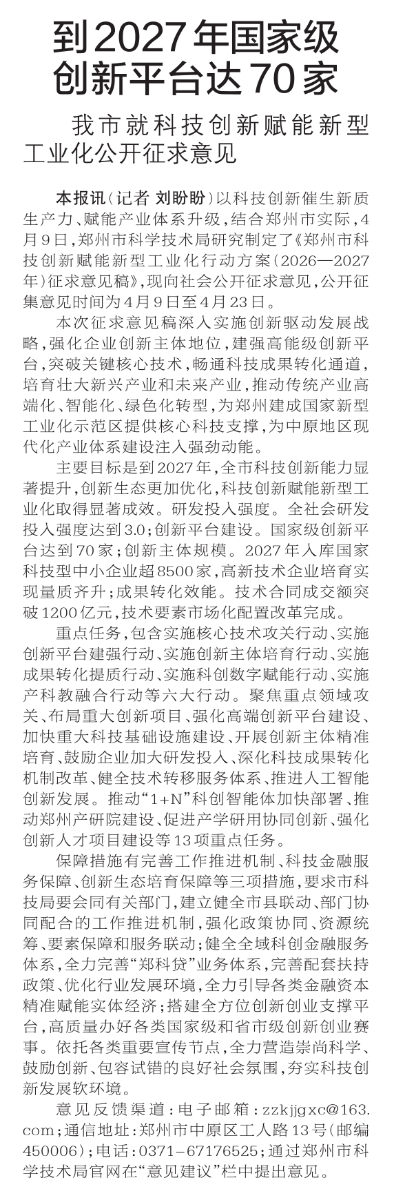 以科技创新催生新质生产力、赋能产业体系升级,结合郑州市实际,4月9日,郑州市科学技术局研究制定了《郑州市科技创新赋能新型工业化行动方案(2026—2027年)征求意见稿》,现向社会公开征求意见,公开征集意见时间为4月9日至4月23日。(今日《郑州日报》2版)
