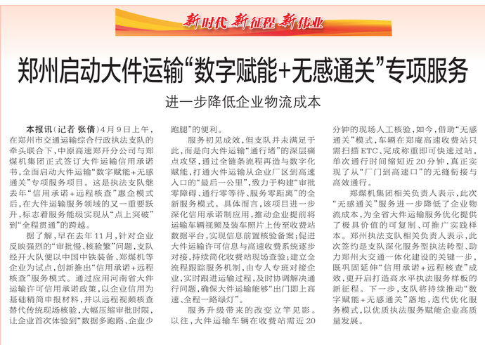 4月9日上午,在郑州市交通运输综合行政执法支队的牵头联合下,中原高速郑开分公司与郑煤机集团正式签订大件运输信用承诺书,全面启动大件运输“数字赋能+无感通关”专项服务项目。这是执法支队继去年“信用承诺+远程核查”惠企模式后,在大件运输服务领域的又一重要跃升,标志着服务能级实现从“点上突破”到“全程贯通”的跨越。(今日《郑州日报》2版)