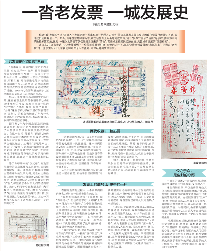 你会“看”发票吗?当“开票人”“发票名称”“税率税额”“纳税人识别号”等信息铺展在规范整洁的现代化收付款凭证上时,或许我们还能解读一二。然而,当这些信息回溯百年,在斑驳宣纸上用毛笔完成书写,留下“发奉”“宝号”“台照”等字样,并由苏州码子进行筹算汇编,这时,一张张发票便不仅仅是贸易往来的“信物”,而变成承载国民经济交流、见证城市发展的“微型档案”。(今日《郑州日报》5版)