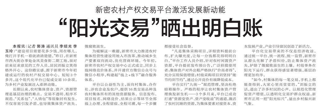 “建设项目需要花多少钱,用在哪儿,俺打开手机一看就清清楚楚。”昨日,在新密市西大街办事处金凤美食街二期工地,面对前来征求意见的工作人员,居民刘振立笑得格外开心。这份踏实感,源于新密市今年初建成运行的农村产权交易中心。短短3个多月,这个现代化平台已促成交易10余项,为乡村产业发展注入澎湃动能。(今日《郑州日报》7版)