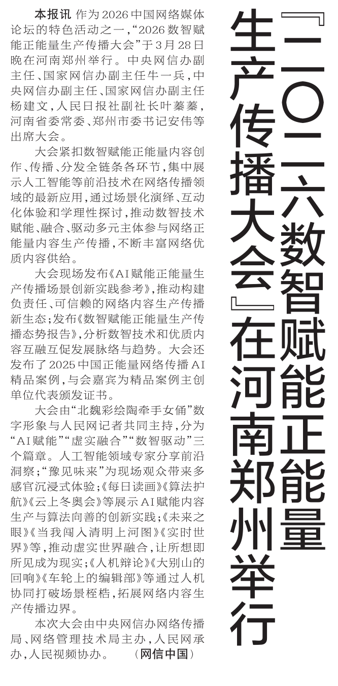 作为2026中国网络媒体论坛的特色活动之一,“2026数智赋能正能量生产传播大会”于3月28日晚在河南郑州举行。中央网信办副主任、国家网信办副主任牛一兵,中央网信办副主任、国家网信办副主任杨建文,人民日报社副社长叶蓁蓁,河南省委常委、郑州市委书记安伟等出席大会。(今日《郑州日报》1版)