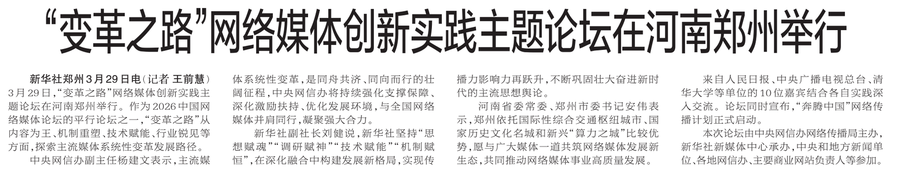 3月29日,“变革之路”网络媒体创新实践主题论坛在河南郑州举行。作为2026中国网络媒体论坛的平行论坛之一,“变革之路”从内容为王、机制重塑、技术赋能、行业锐见等方面,探索主流媒体系统性变革发展路径。(今日《郑州日报》1版)