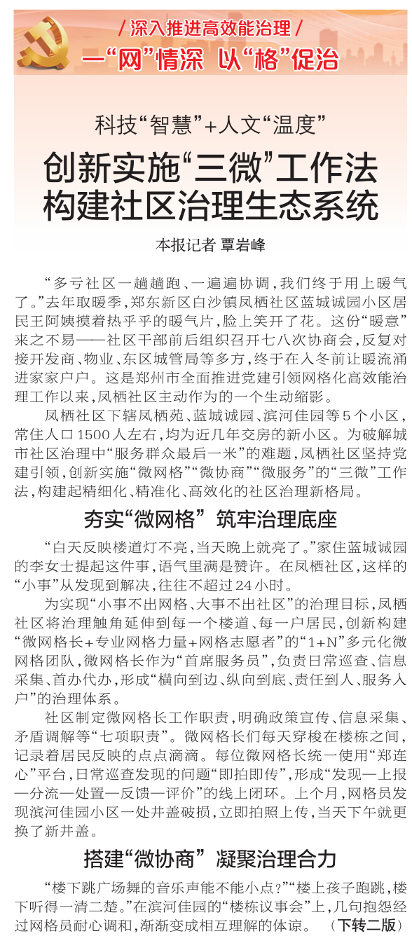 “多亏社区一趟趟跑、一遍遍协调,我们终于用上暖气了。”去年取暖季,郑东新区白沙镇凤栖社区蓝城诚园小区居民王阿姨摸着热乎乎的暖气片,脸上笑开了花。这份“暖意”来之不易——社区干部前后组织召开七八次协商会,反复对接开发商、物业、东区城管局等多方,终于在入冬前让暖流涌进家家户户。这是郑州市全面推进党建引领网格化高效能治理工作以来,凤栖社区主动作为的一个生动缩影。(今日《郑州日报》1版、2版)