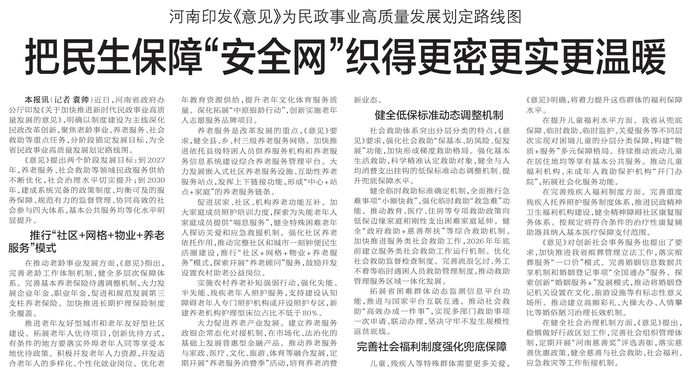 近日,河南省政府办公厅印发《关于加快推进新时代民政事业高质量发展的意见》,明确以制度建设为主线深化民政改革创新,聚焦老龄事业、养老服务、社会救助等重点任务,分阶段锚定发展目标,为全省民政事业高质量发展划定路线图。(今日《郑州日报》2版)