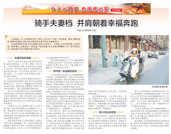 又是新的一天,许仙英如往常一样早上8点出门,开始一天的奔波。接单、取餐、配送,她骑车穿梭在大街小巷,经常和同为骑手的丈夫擦肩而过。(今日《郑州日报》2版)