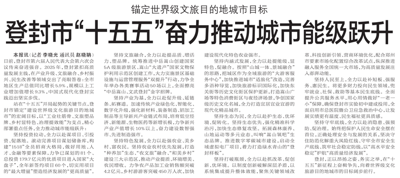 日前,登封市第六届人民代表大会第六次会议传来奋进强音。2025年,登封紧扣高质量发展主线,在产业升级、文旅融合、乡村振兴、民生改善等领域交出了亮眼答卷:全市地区生产总值同比增长5.9%,规模以上工业增加值增长9.3%,中国式现代化登封实践迈出坚实步伐。(今日《郑州日报》5版)
