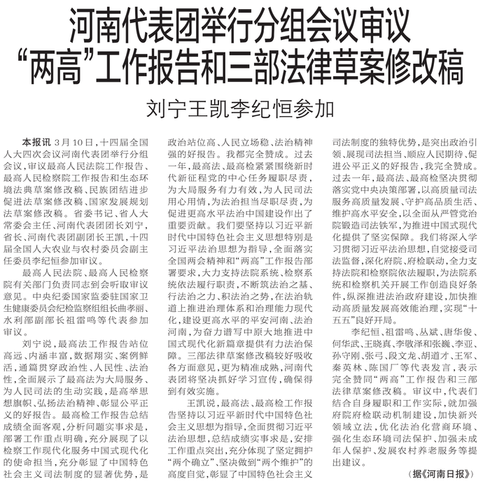 3月10日,十四届全国人大四次会议河南代表团举行分组会议,审议最高人民法院工作报告、最高人民检察院工作报告和生态环境法典草案修改稿、民族团结进步促进法草案修改稿、国家发展规划法草案修改稿。省委书记、省人大常委会主任、河南代表团团长刘宁,省长、河南代表团副团长王凯,十四届全国人大农业与农村委员会副主任委员李纪恒参加审议。(今日《郑州日报》1版)