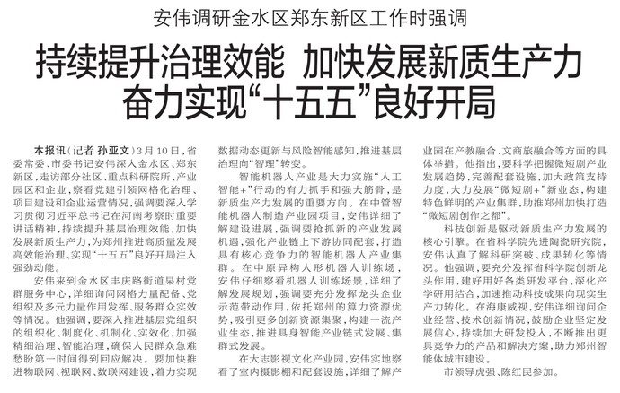 3月10日,省委常委、市委书记安伟深入金水区、郑东新区,走访部分社区、重点科研院所、产业园区和企业,察看党建引领网格化治理、项目建设和企业运营情况,强调要深入学习贯彻习近平总书记在河南考察时重要讲话精神,持续提升基层治理效能,加快发展新质生产力,为郑州推进高质量发展高效能治理、实现“十五五”良好开局注入强劲动能。(今日《郑州日报》1版)