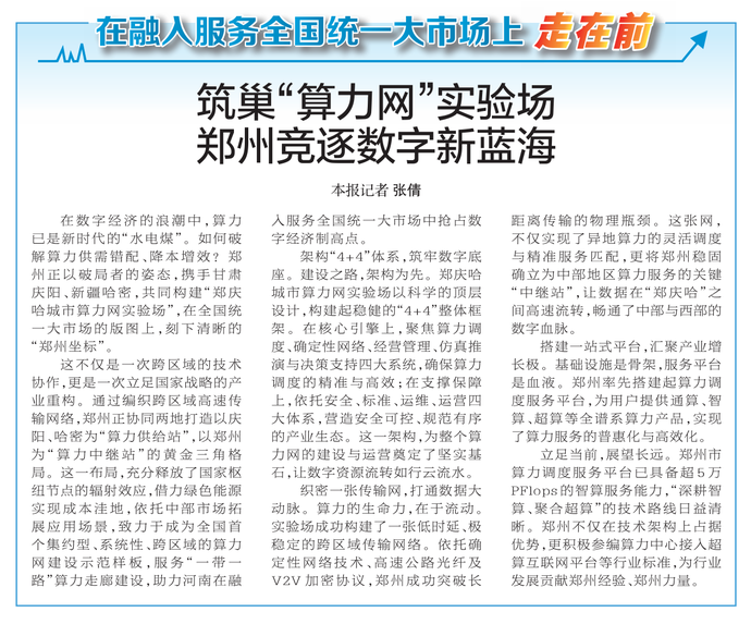 在数字经济的浪潮中,算力已是新时代的“水电煤”。如何破解算力供需错配、降本增效?郑州正以破局者的姿态,携手甘肃庆阳、新疆哈密,共同构建“郑庆哈城市算力网实验场”,在全国统一大市场的版图上,刻下清晰的“郑州坐标”。(今日《郑州日报》1版)
