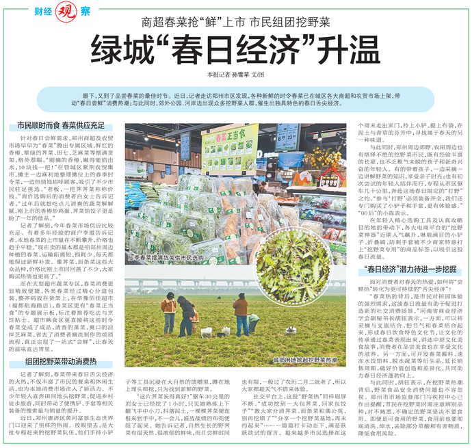 眼下,又到了品尝春菜的最佳时节。近日,记者走访郑州市区发现,各种新鲜的时令春菜已在城区各大商超和农贸市场上架,带动“春日尝鲜”消费热潮;与此同时,郊外公园、河岸边出现众多挖野菜人群,催生出独具特色的春日舌尖经济。(今日《郑州日报》6版)