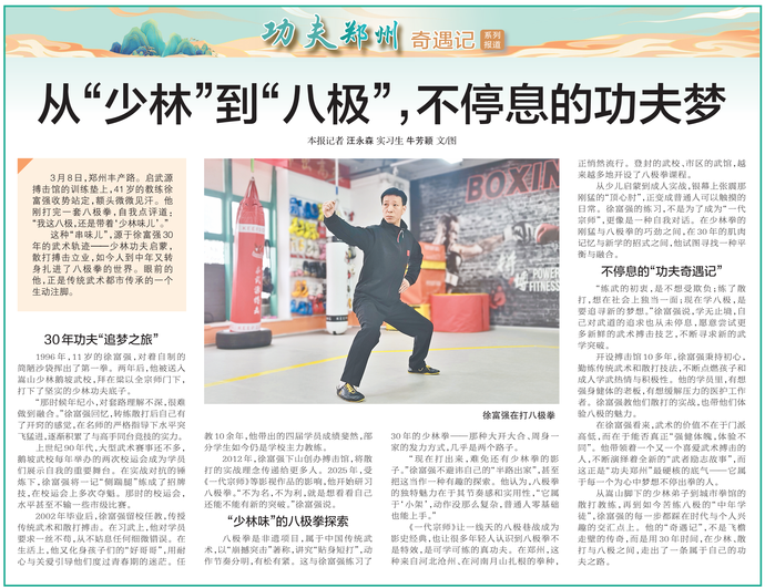 3月8日,郑州丰产路。启武源搏击馆的训练垫上,41岁的教练徐富强收势站定,额头微微见汗。他刚打完一套八极拳,自我点评道:“我这八极,还是带着‘少林味儿’。”(今日《郑州日报》8版)