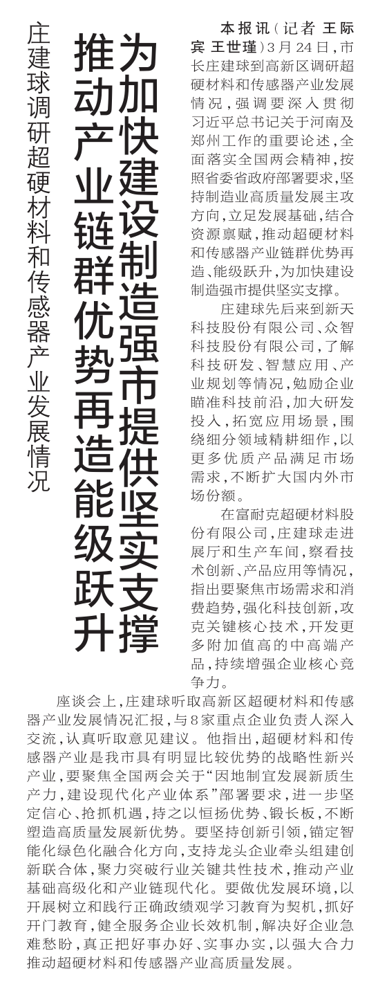 3月24日,市长庄建球到高新区调研超硬材料和传感器产业发展情况,强调要深入贯彻习近平总书记关于河南及郑州工作的重要论述,全面落实全国两会精神,按照省委省政府部署要求,坚持制造业高质量发展主攻方向,立足发展基础,结合资源禀赋,推动超硬材料和传感器产业链群优势再造、能级跃升,为加快建设制造强市提供坚实支撑。(今日《郑州日报》1版)