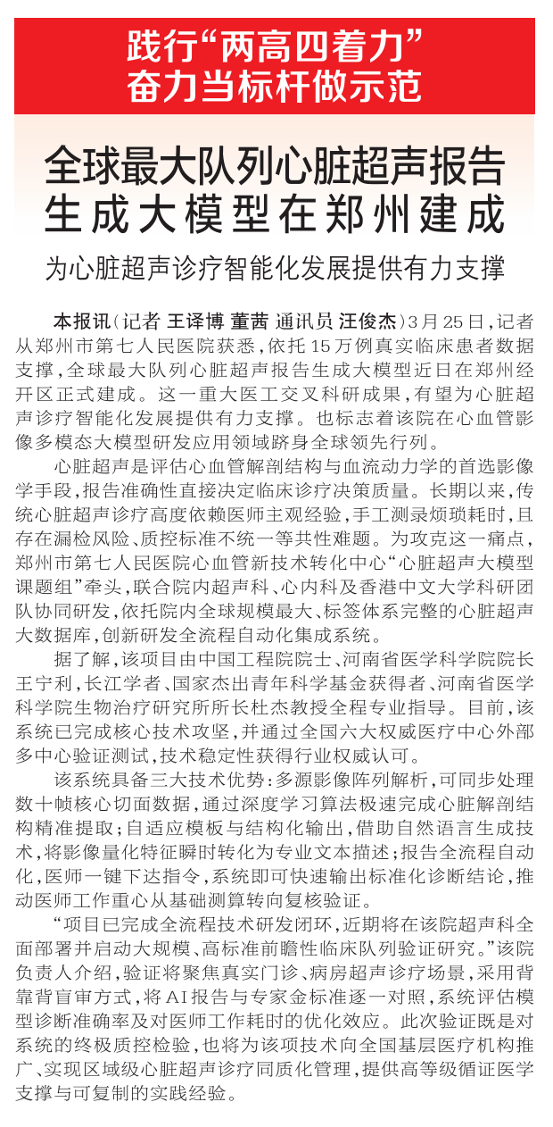 3月25日,记者从郑州市第七人民医院获悉,依托15万例真实临床患者数据支撑,全球最大队列心脏超声报告生成大模型近日在郑州经开区正式建成。这一重大医工交叉科研成果,有望为心脏超声诊疗智能化发展提供有力支撑。也标志着该院在心血管影像多模态大模型研发应用领域跻身全球领先行列。(今日《郑州日报》1版)