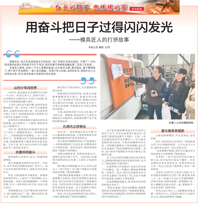 傍晚时分,巩义市先进制造业开发区的一处厂房里灯光渐次亮起。忙碌了一天的陈迎春先给读大学的孩子们打个电话,然后和妻子徐晚菊商量起第二天的工作安排。(今日《郑州日报》2版)