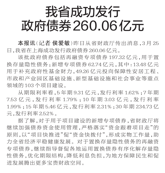 昨日从省财政厅传出消息,3月25日,我省在上海成功发行政府债券260.06亿元。(今日《郑州日报》2版)