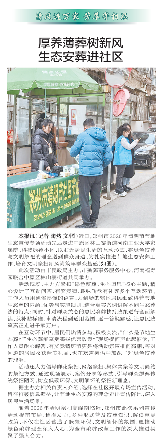 近日,郑州市2026年清明节节地生态宣传专场活动先后走进中原区林山寨街道河南工业大学家属院、科技绿苑小区,以贴近居民生活的互动形式,将绿色殡葬与文明祭祀的理念送到群众身边,为扎实推进节地生态安葬工作、培育文明祭扫新风尚筑牢群众基础。(今日《郑州日报》2版)