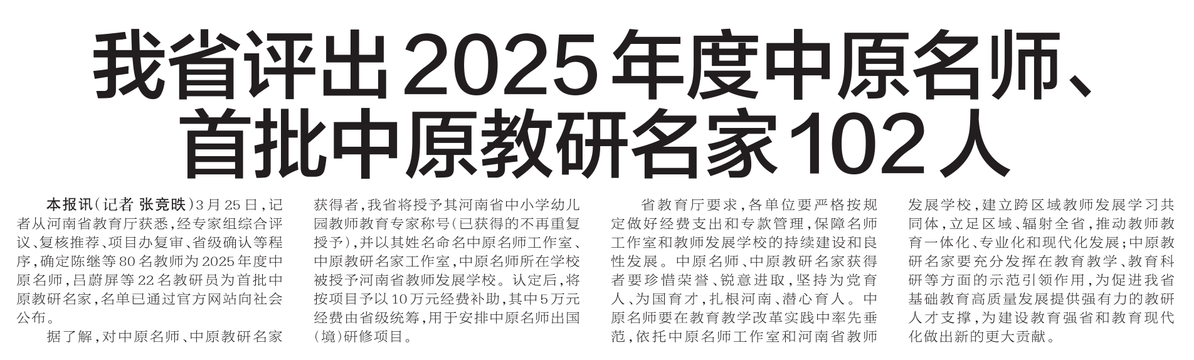 3月25日,记者从河南省教育厅获悉,经专家组综合评议、复核推荐、项目办复审、省级确认等程序,确定陈继等80名教师为2025年度中原名师,吕蔚屏等22名教研员为首批中原教研名家,名单已通过官方网站向社会公布。(今日《郑州日报》5版)