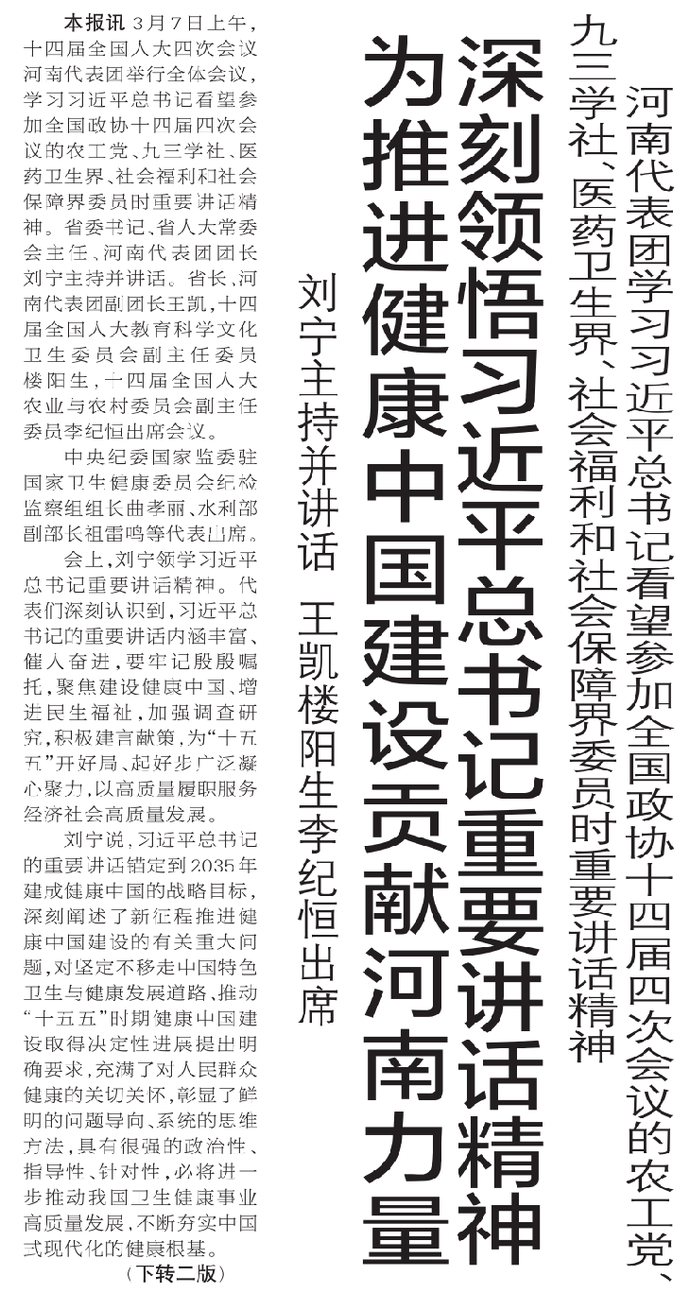 河南代表团学习习近平总书记看望参加全国政协十四届四次会议的农工党、九三学社、医药卫生界、社会福利和社会保障界委员时重要讲话精神