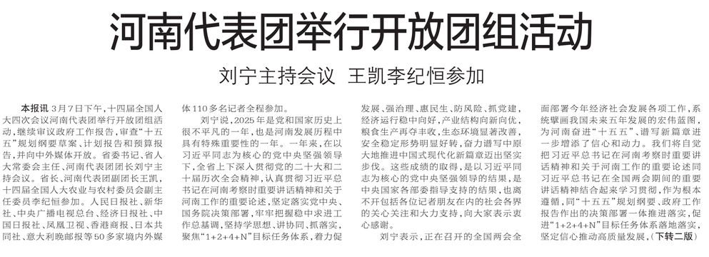 3月7日下午,十四届全国人大四次会议河南代表团举行开放团组活动,继续审议政府工作报告,审查“十五五”规划纲要草案、计划报告和预算报告,并向中外媒体开放。省委书记、省人大常委会主任、河南代表团团长刘宁主持会议。省长、河南代表团副团长王凯,十四届全国人大农业与农村委员会副主任委员李纪恒参加。人民日报社、新华社、中央广播电视总台、经济日报社、中国日报社、凤凰卫视、香港商报、日本共同社、意大利晚邮报等50多家境内外媒体110多名记者全程参加。(今日《郑州日报》1版、2版)