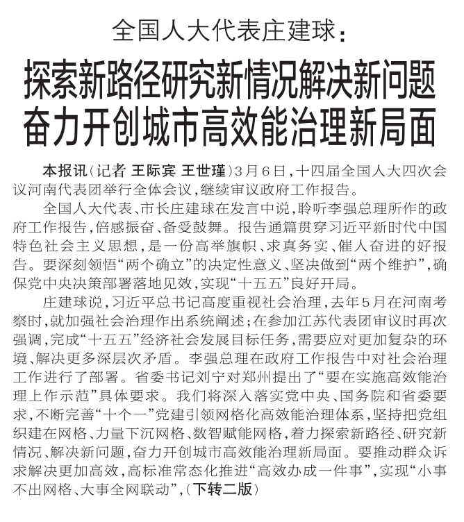 全国人大代表、市长庄建球在发言中说,聆听李强总理所作的政府工作报告,倍感振奋、备受鼓舞。报告通篇贯穿习近平新时代中国特色社会主义思想,是一份高举旗帜、求真务实、催人奋进的好报告。要深刻领悟“两个确立”的决定性意义、坚决做到“两个维护”,确保党中央决策部署落地见效,实现“十五五”良好开局。(今日《郑州日报》1版、2版)