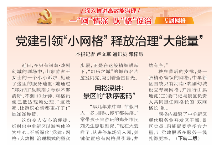 近日,在只有河南·戏剧幻城的剧场中,山东游客王女士的一个小小诉求,见证了这里的服务速度:她通过“郑好拍”反映指引标识不够清晰,不到10分钟,网格员便已抵达现场处理。“这效率,让游玩心情都更好了!”她连连称赞。(今日《郑州日报》1版、2版)
