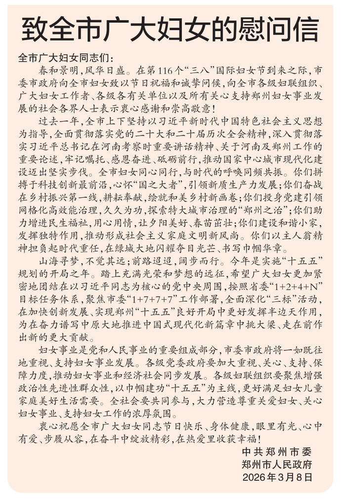 春和景明,风华日盛。在第116个“三八”国际妇女节到来之际,市委市政府向全市妇女致以节日祝福和诚挚问候,向全市各级妇联组织、广大妇女工作者、各级各有关单位以及所有关心支持郑州妇女事业发展的社会各界人士表示衷心感谢和崇高敬意!(今日《郑州日报》1版)