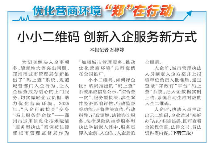 为切实解决入企事项多、随意性大等突出问题,郑州市城市管理局创新推出了“码上查”系统,规范城管部门入企行为,让入企检查成为暖心的上门服务,切实减轻企业负担,助力优化营商环境。2025年,“入企行政检查”变身“码上服务纾企忧”——郑州市运用信息化技术赋能“服务型执法”案例被住建部城市管理监督局作为“加强城市管理服务、推动优化营商环境”典型案例在全国推广。(今日《郑州日报》1版、2版)
