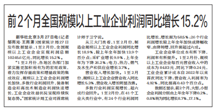 前2个月全国规模以上工业企业利润同比增长15.2%