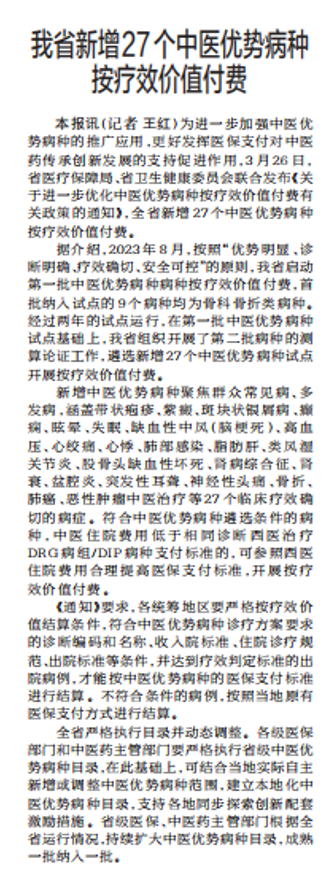 为进一步加强中医优势病种的推广应用,更好发挥医保支付对中医药传承创新发展的支持促进作用,3月26日,省医疗保障局、省卫生健康委员会联合发布《关于进一步优化中医优势病种按疗效价值付费有关政策的通知》,全省新增27个中医优势病种按疗效价值付费。(今日《郑州日报》1版)