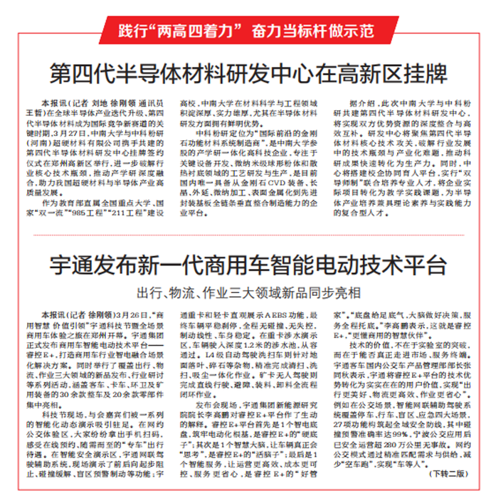 在全球半导体产业迭代升级、第四代半导体材料成为国际竞争新赛道的关键时期,3月27日,中南大学与中科粉研(河南)超硬材料有限公司携手共建的第四代半导体材料研发中心挂牌签约仪式在郑州高新区举行,进一步破解行业核心技术瓶颈,推动产学研深度融合,助力我国超硬材料与半导体产业高质量发展。(今日《郑州日报》1版)
