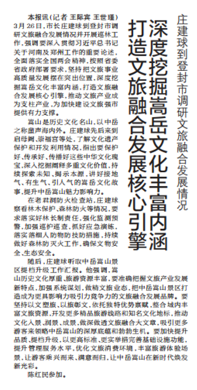 3月26日,市长庄建球到登封市调研文旅融合发展情况并开展巡林工作,强调要深入贯彻习近平总书记关于河南及郑州工作的重要论述,全面落实全国两会精神,按照省委省政府部署要求,坚持把文旅事业高质量发展摆在突出位置,深度挖掘嵩岳文化丰富内涵,打造文旅融合发展核心引擎,推动文旅产业成为支柱产业,为加快建设文旅强市提供有力支撑。(今日《郑州日报》1版)