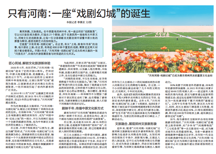 黄河奔腾,文脉绵延。在中原腹地郑州中牟,有一座这样的“戏剧聚落”,它以622亩空间为载体,打造出21个剧场,近千名演员用一场场有关中原文化、河南文化的戏剧表演,让每一位访客都能在光影流转中读懂中原大地的厚重与鲜活,感受戏剧艺术的独特魅力。(今日《郑州日报》2版)