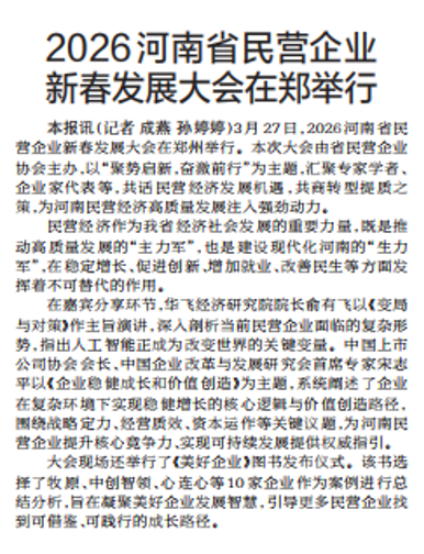 3月27日,2026河南省民营企业新春发展大会在郑州举行。本次大会由省民营企业协会主办,以“聚势启新,奋激前行”为主题,汇聚专家学者、企业家代表等,共话民营经济发展机遇,共商转型提质之策,为河南民营经济高质量发展注入强劲动力。(今日《郑州日报》2版)