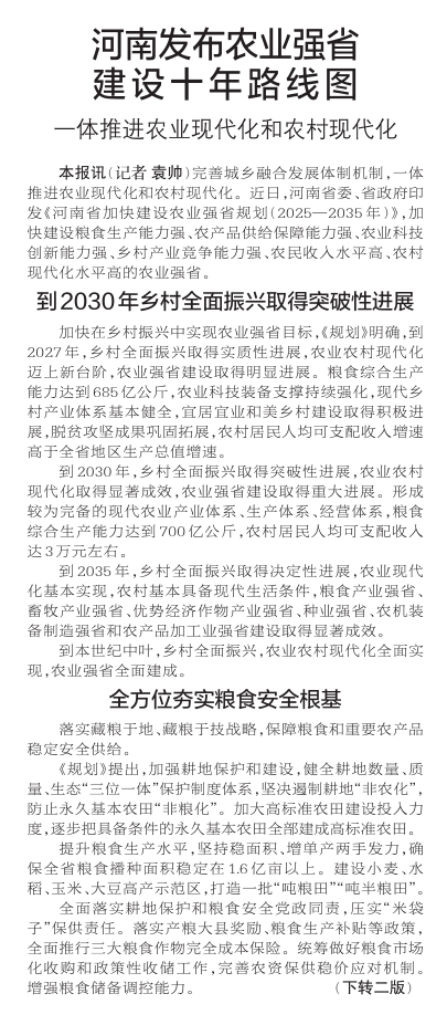 完善城乡融合发展体制机制,一体推进农业现代化和农村现代化。近日,河南省委、省政府印发《河南省加快建设农业强省规划(2025—2035年)》,加快建设粮食生产能力强、农产品供给保障能力强、农业科技创新能力强、乡村产业竞争能力强、农民收入水平高、农村现代化水平高的农业强省。(今日《郑州日报》1版、2版)