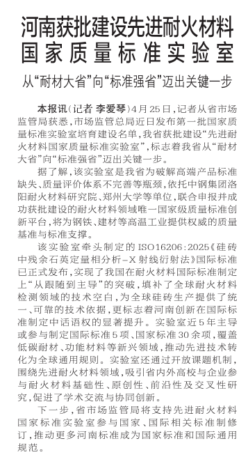 4月25日,记者从省市场监管局获悉,市场监管总局近日发布第一批国家质量标准实验室培育建设名单,我省获批建设“先进耐火材料国家质量标准实验室”,标志着我省从“耐材大省”向“标准强省”迈出关键一步。(今日《郑州日报》1版)