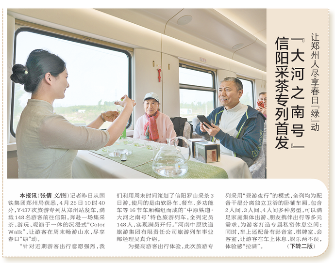 记者昨日从国铁集团郑州局获悉,4月25日10时40分,Y437次旅游专列从郑州站发车,满载148名游客前往信阳,奔赴一场集采茶、游玩、观演于一体的沉浸式“Color Walk”,让游客在周末畅游山水,尽享春日“绿”动。(今日《郑州日报》1版、2版)