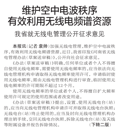 加强无线电管理,维护空中电波秩序,有效利用无线电频谱资源,近日,我省印发《河南省无线电管理办法(草案送审稿)》,公开向社会征求意见。(今日《郑州日报》1版、2版)