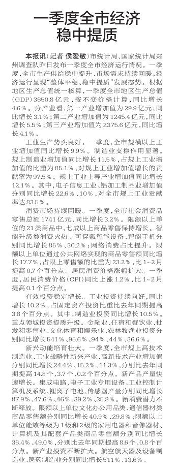 市统计局、国家统计局郑州调查队昨日发布一季度全市经济运行情况。一季度,全市生产供给稳中提升、市场需求持续回暖,经济运行呈现“整体平稳、稳中提质”发展态势。根据地区生产总值统一核算,一季度全市地区生产总值(GDP)3650.8亿元,按不变价格计算,同比增长4.6%。分产业看,第一产业增加值为29.9亿元,同比增长3.1%;第二产业增加值为1245.4亿元,同比增长5.5%;第三产业增加值为2375.6亿元,同比增长4.1%。(今日《郑州日报》2版)