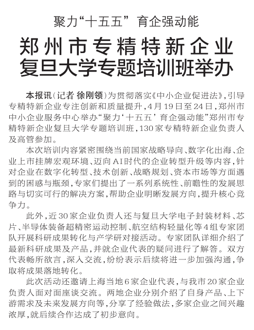 为贯彻落实《中小企业促进法》,引导专精特新企业专注创新和质量提升,4月19日至24日,郑州市中小企业服务中心举办“聚力‘十五五’ 育企强动能”郑州市专精特新企业复旦大学专题培训班,130家专精特新企业负责人及高管参加。(今日《郑州日报》2版)