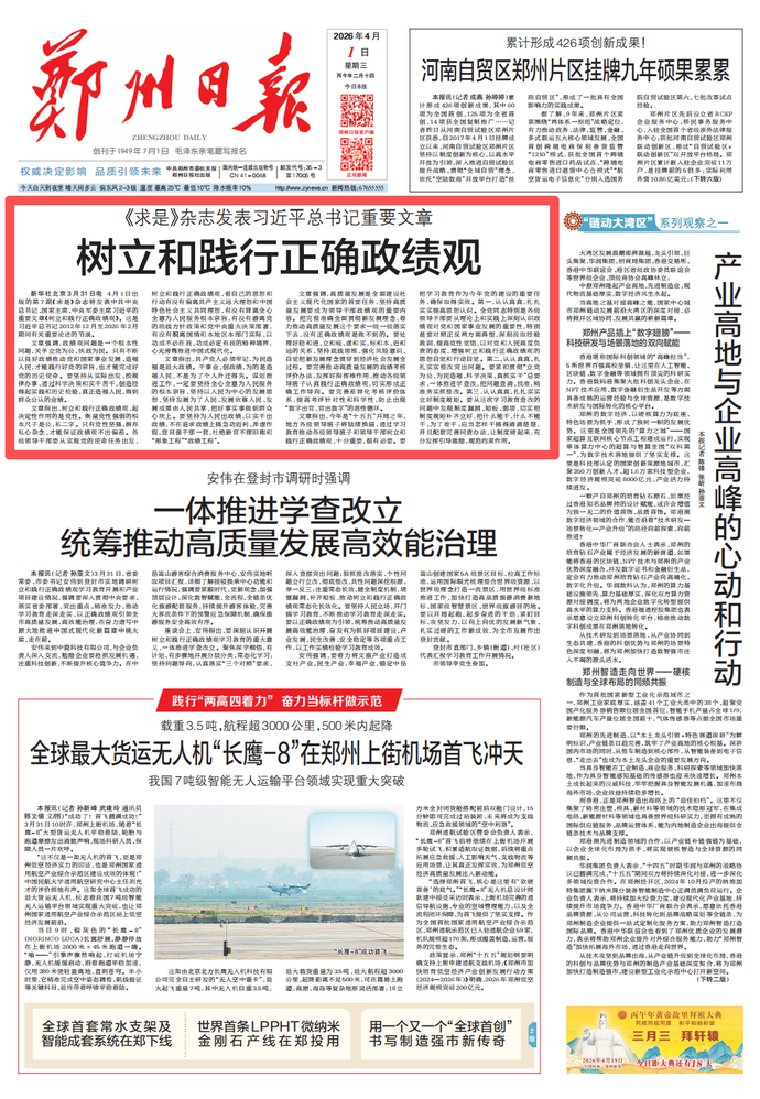 4月1日出版的第7期《求是》杂志将发表中共中央总书记、国家主席、中央军委主席习近平的重要文章《树立和践行正确政绩观》。这是习近平总书记2012年12月至2026年2月期间有关重要论述的节录。(今日《郑州日报》1版)