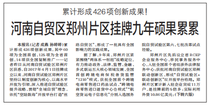 累计形成426项创新成果,其中60项为全国首创,125项为全省首创,14项获全国复制推广……记者昨日从河南自贸试验区郑州片区获悉,自2017年4月1日挂牌成立以来,河南自贸试验区郑州片区坚持以制度创新为核心,以高水平开放为引领,深入推进自贸试验区提升战略,贯彻“全域自贸”理念,依托“空陆数海”开放平台打造“丝路自贸区”,形成了一批具有全国影响力的实践成果(今日《郑州日报》1版、6版)