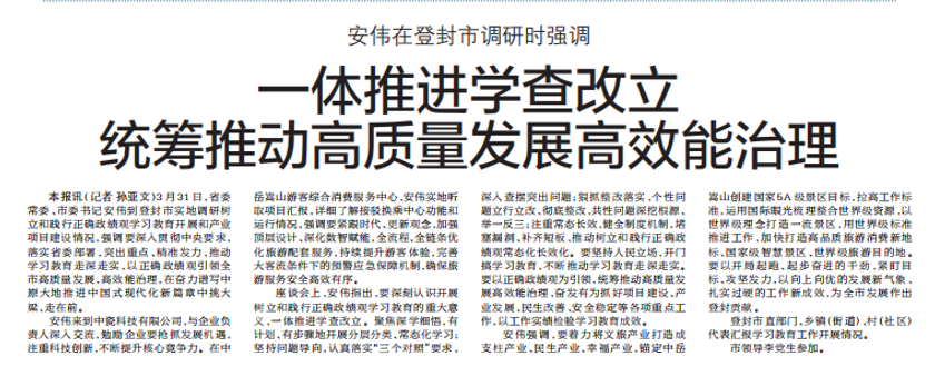 3月31日,省委常委、市委书记安伟到登封市实地调研树立和践行正确政绩观学习教育开展和产业项目建设情况,强调要深入贯彻中央要求,落实省委部署,突出重点、精准发力,推动学习教育走深走实,以正确政绩观引领全市高质量发展、高效能治理,在奋力谱写中原大地推进中国式现代化新篇章中挑大梁、走在前。(今日《郑州日报》1版)