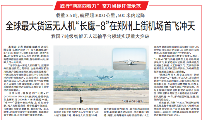 “成功了!首飞圆满成功!”3月31日10时许,郑州上街机场,随着“长鹰-8”大型货运无人机平稳着陆,轮胎与跑道摩擦发出清脆声响,现场科研人员、保障人员一片欢呼。(今日《郑州日报》1版)