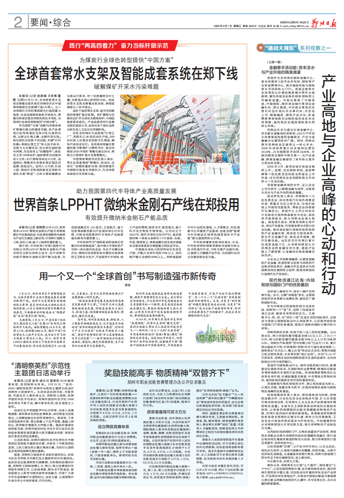3月31日,世界首条LPPHT微纳米金刚石产线在郑州高新区中试基地启动,标志着我国微纳米金刚石产业化发展迈上新征程,对郑州打造算力之城、钻石之城、量子之城具有重要意义。(今日《郑州日报》2版)